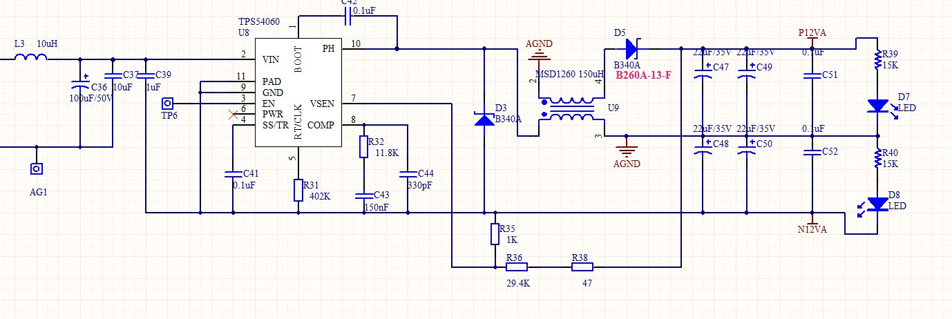 电路完全按着SLVA369A做的,目前24V输入,准备输出正负12V,但是现在正电压输出20V,负电压输出-4V,正负电源后端无负载,目前无从查起,焊接了两块,症状一样,谁遇到过类似问题,分享下经验,另求专家帮忙找下原因?