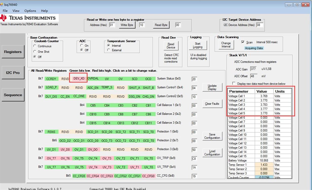 我用EV2300+BQ76940EVM板按照手册bq76930 and bq76940 Evaluation Module User's Guide 操作,连接上了以后,上位机只能显示前面五节的电压,,且DEVICE_XREADY那一位一直是1,且我看了bq76930 and bq76940 Evaluation Module User's Guide手册上,也是显示只采集了前五节,