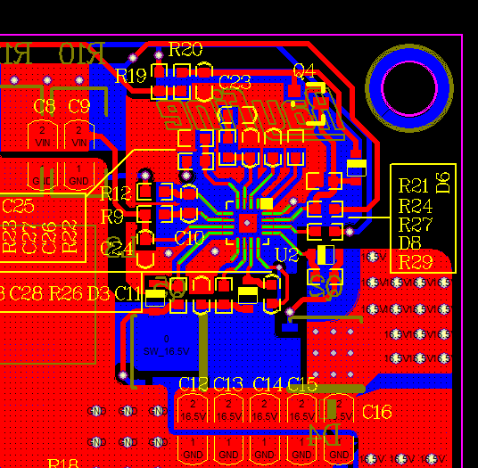 使用TPS43060,做一各10.8-13.2VDC,12VDC升压到17VDC的负载50W的一个驱动,低边MOS波形正常,高边MOS波形在某些地方有提前关断或者就没打开的情况,电路的输出负载均可以满足,但是高边MOS比较热,且效率不高。原理图如下,PCB图如下;