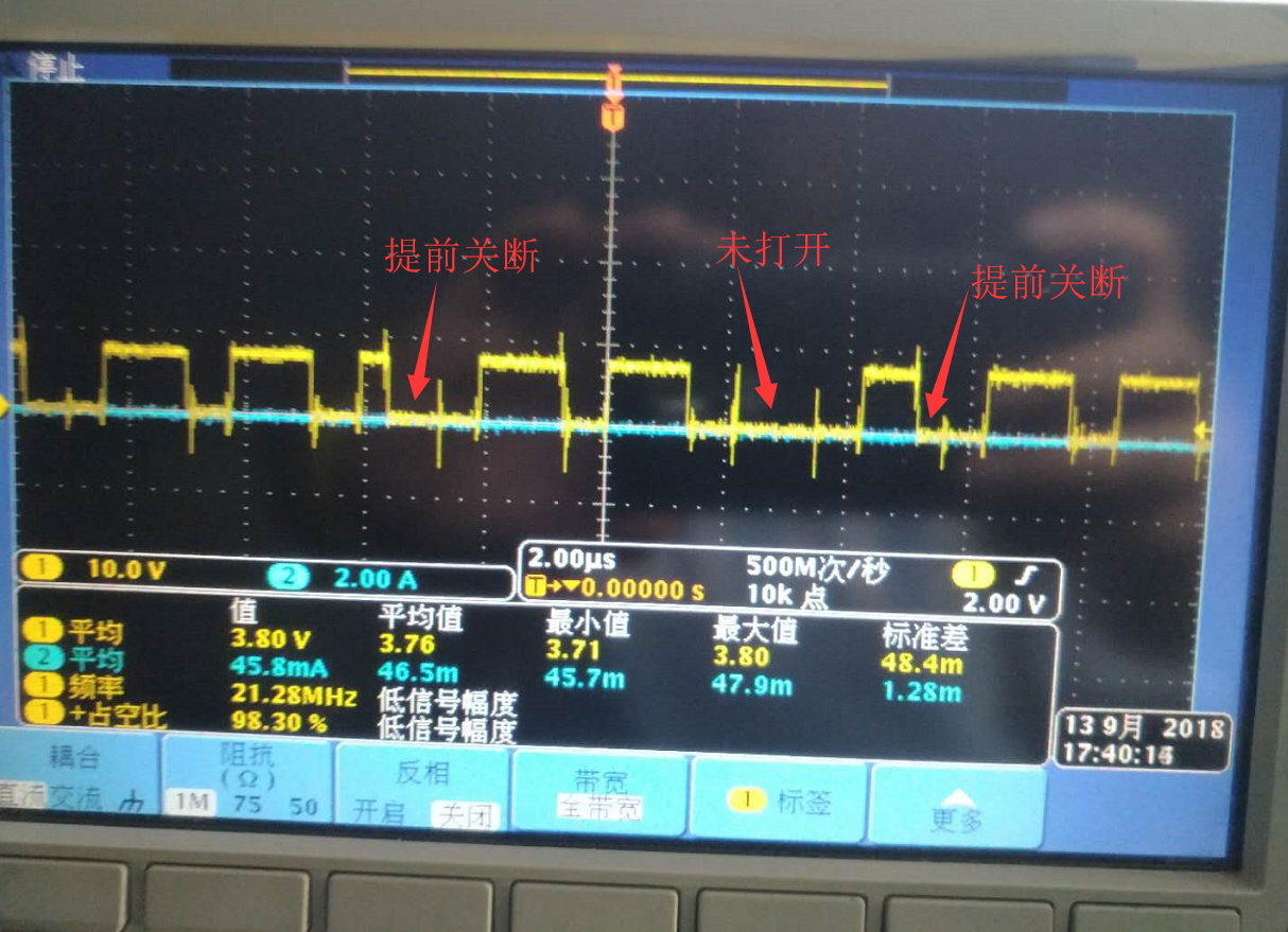低边MOS波形正常;高边MOS在周期内,关断高边有时提前,有时根本就没打开;