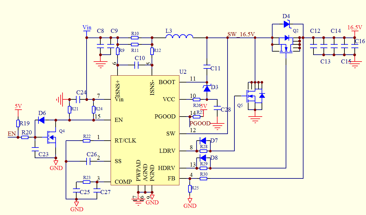 选用的高边和低边MOS的Qg都在20nC;RT=121KR,fSW=475kHZ;