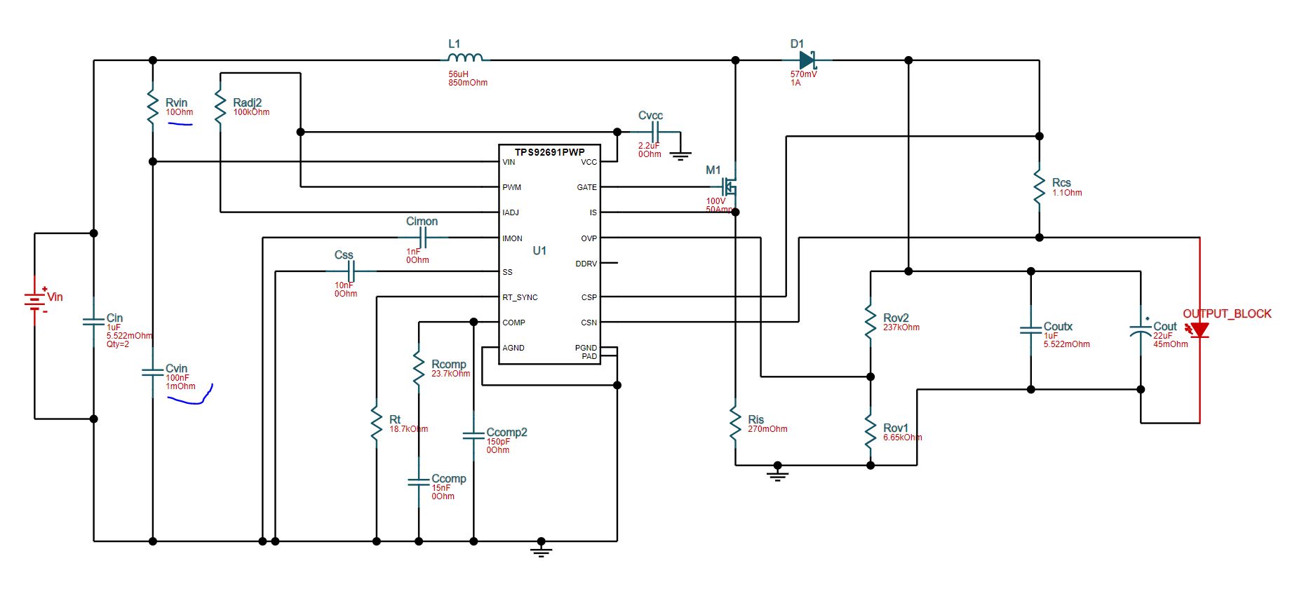 我的输入是24V直流,但为了保险起见我设置的输入是23~25V。 我驱动的LED是一颗COB LED。Typical电流是0.17A,功率6.1W。我现在的问题是在WEBENCH的推荐设计中在输入电压到Vin之间官方给连接了一颗10Ω,1/4W的电阻Rvin,然后在Vin和GND之间连接0.1uF的电容Cvin。