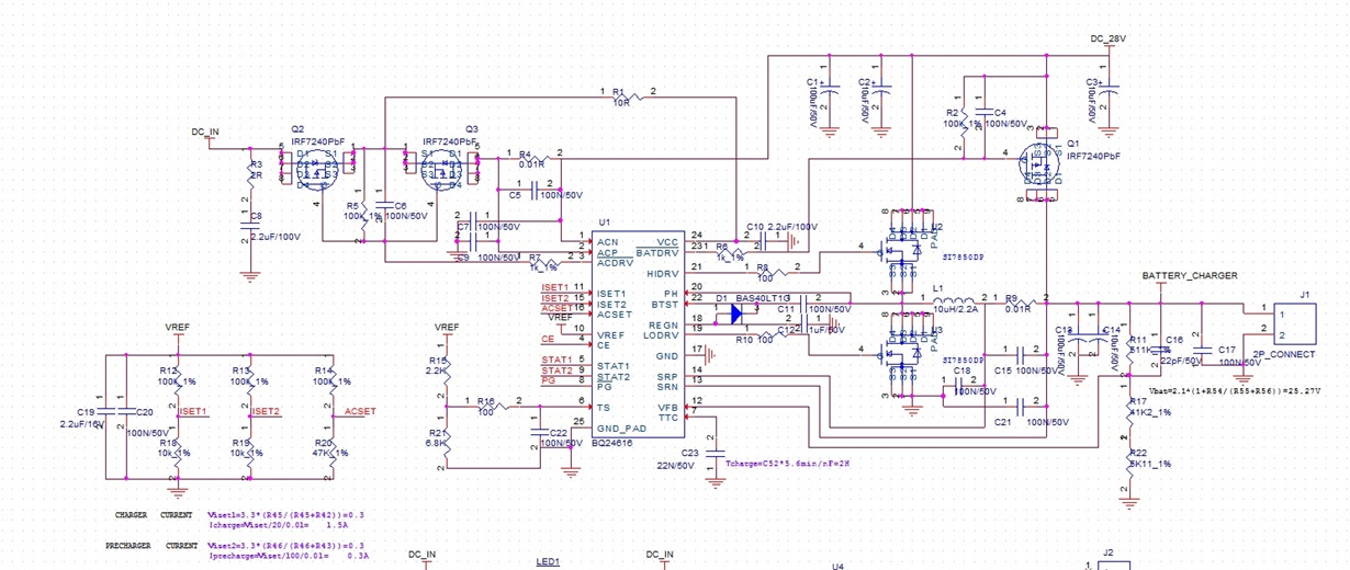 图中的电阻我进行了更改,将R11改成41.2K,R22改成0,这样根据公式得出Vbat电压为2.1*(1+R11/R17)=4.2V,为1S充电,现在输入电压为9V,在不接电池的情况下,PG=low,说明输入电压正常,STAT1=OFF以及STAT2=OFF,也是正常的,测量J1电压为9V,这是什么原因?我在J1端增加电子负载,使用0.1A电流横流放电的时候J1端电压在2.4V~3.0V之间跳变,HIDRV输出波形也是抖动的,LODRV无输出,STAT1=OFF以及STAT2=OFF(不正确),有其他方法进行测试吗?