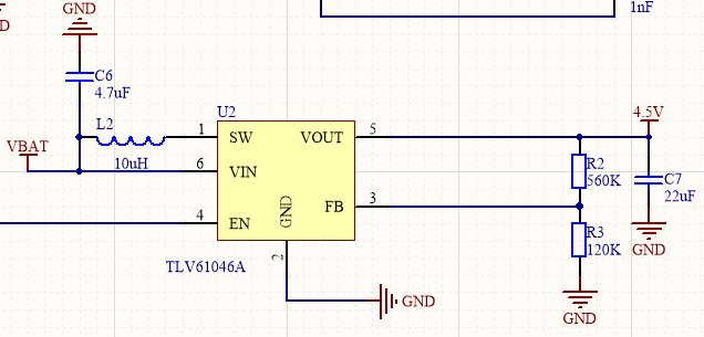 我的设计是输入2~4.5v,输出要求4.5V,输出电流150mA,具体外围元器件如图,L2是功率电感,C6,C7用的是0805的电容,PCB布线按照DATASHEET的推荐,