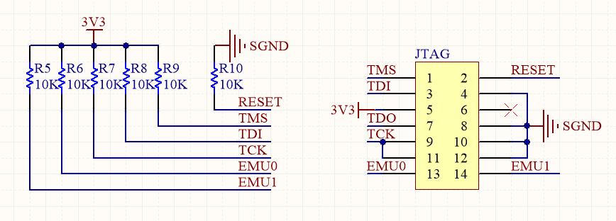 UCD3138的JTAG接口电路图哪里有?这样连接,CCS6.1.3用XDS100V3连接的时候反馈出EMU0和EMU1无法监测的错误信息,这两个管脚怎么处理?