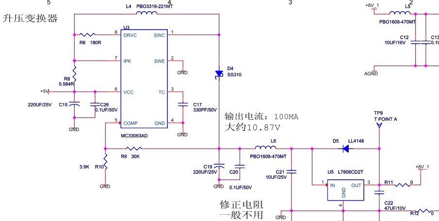 问题:MC33063外围电路上的电感有很大的啸叫声,先前测试出MC33063的PIN1(CH1)&PIN8(CH2)&PIN3(CH3)输出波形不是很稳定,本来以为是工作不稳定导致电感啸叫,但是通过调整CT的大小,测试得到满意的结果,现在从测得波形可以看出电路工作是稳定的,可是为什么电感还会啸叫?