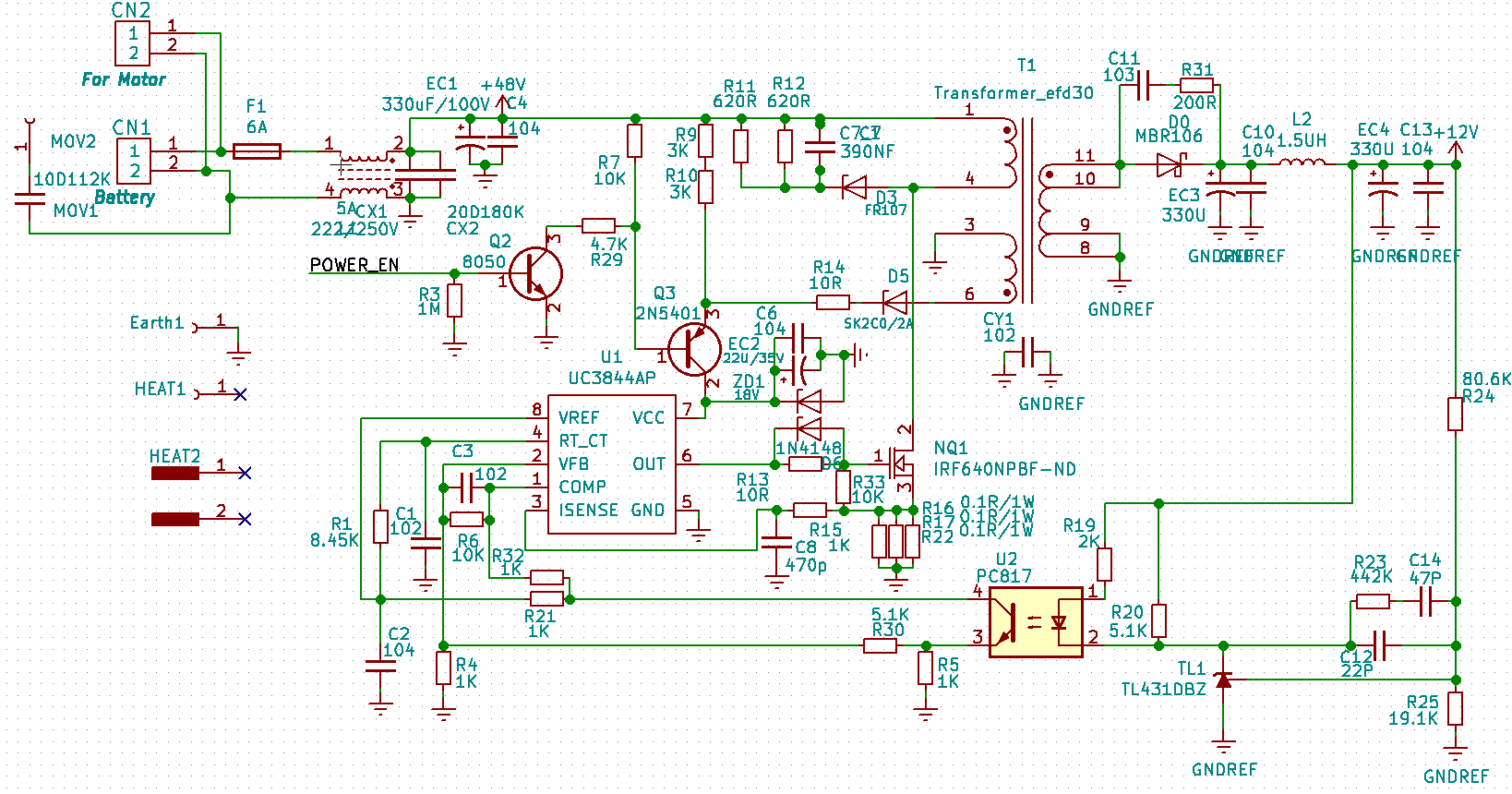 UC3844电源电流生成的设计报告是12V5A,实际做出来的只能去到1A,然后增加负载就被拉低了。变压器都做了很多个了,频率也更改了。原理图中R32,R4没有焊接,R21焊接0R。