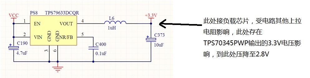 原理图是这样的,此处存在一定几率TPS79633不工作,导致此电路电压本应为3.3V,实为2.8V。