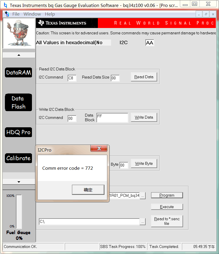 BQ34Z100 Comm error code = 772 我应该怎么烧录生产文件?