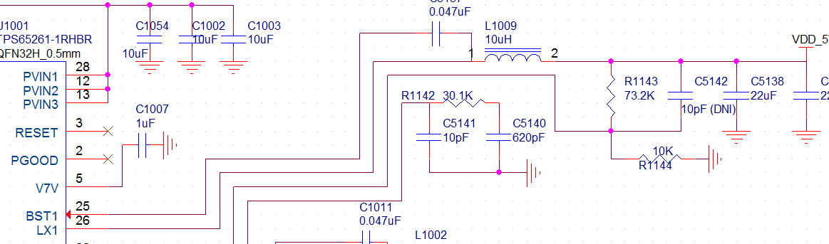 TPS65261 DC-DC同步降压转换器LX1引脚所接电感输入端波形不稳。电路如下: