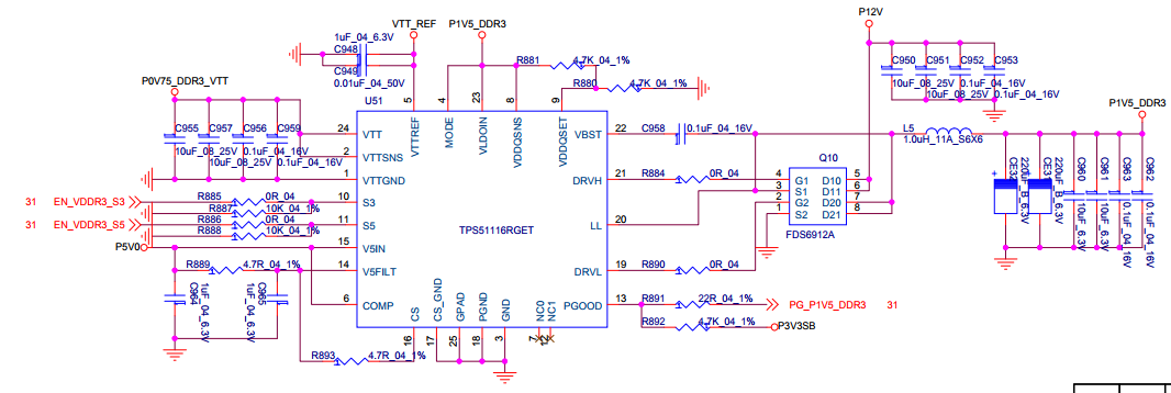 用TPS51116给DDR3供电,电路图如下图所示,D-CAP模式,实测无P1V5_DDR3输出,上电瞬间只在LL端测试到一个12V/100ns的高脉冲,求教如何解决?