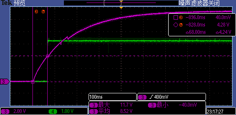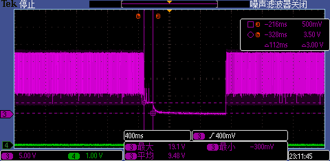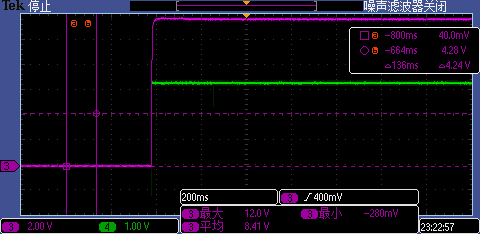 1、PWM直连3.3V,连线后稳压源给电,54200不会启动(54201正常工作),3.3V与12V波形如下:(可能是由于稳压源电源有个软启动过程)