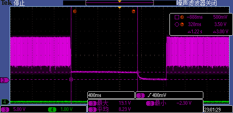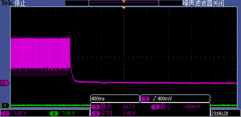 2、PWM直连3.3V情况下,掉电时BOOT引脚异常,波形如下:BOOT引脚残压3V左右时间1.2s,残压期间再次上电,54200无法正常工作(完全掉电后,才可正常工作)