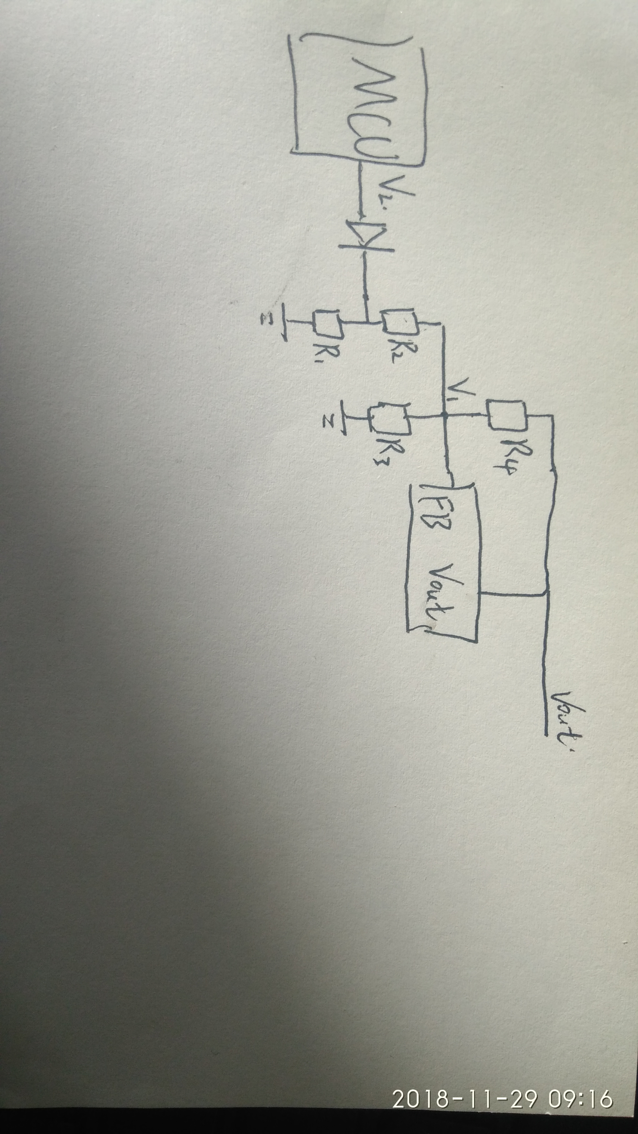 附上草图,本来是想直接用DA输入改变FB而进行调压,但是不知道DA电压小于FB参考电压1.221时反向电流会不会损坏MCU,所以加上二极管。