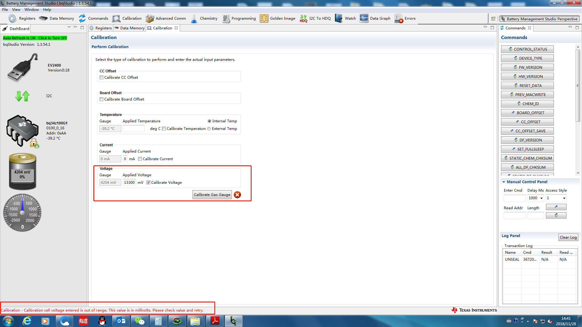 充电最高电压13.65V,通过外部电阻分压,到bat脚的电压为0.9V以下,软件上设置VOLSEL=1. 实测电池包电压为13.3V ,进入校验界面输入Applied Voltage=13300, 校验说超出范围,校验不成功,如下图。搞不懂那里出现问题?