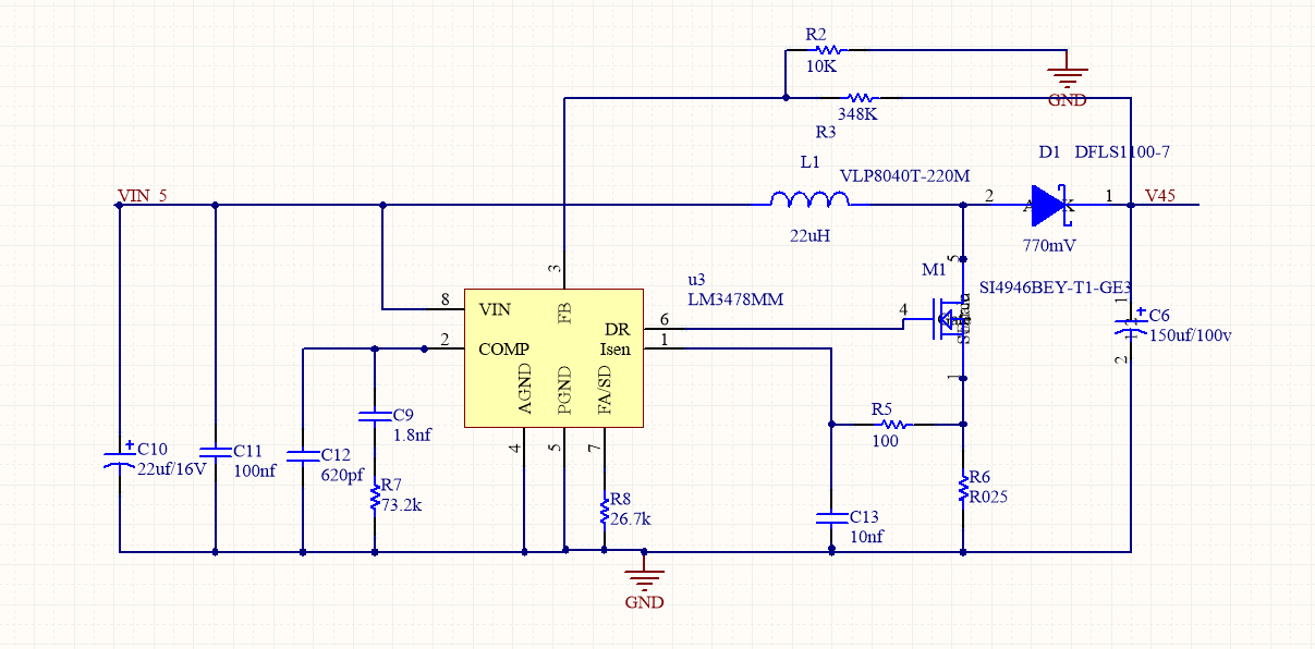 参考WEBENCH  使用LM3478设计 5V电源输入,45输出。参数如图。