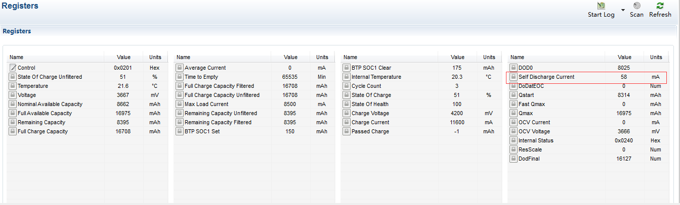 1, 在Registers页面中有一条只读信息“ Self Discharge Current”,在我做成的电池中显示高达50mA左右的数值如附图 ,不太明白这个电流是如何被检测?代表的实际意义是什么?按技术参考文件说明理解为电芯内部微短路自放电流,这样的理解是正确的吗?如果确实是指示电芯内部自放电大小,那这个值显然是不正确的,是否可以更详细解释一下这条信息的具体意义以及数值的量侧依据。