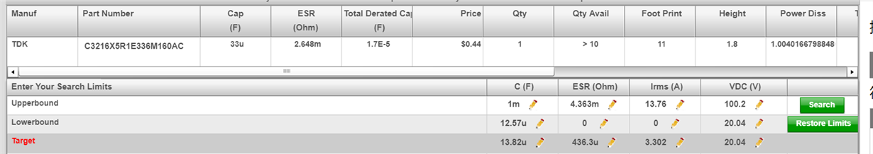 比如说 TDK的 C3216X5R1E336M160AC ,webench中的 esr 为 0.9 mohm , 而tdk 给的值是 2.5 mohm 。