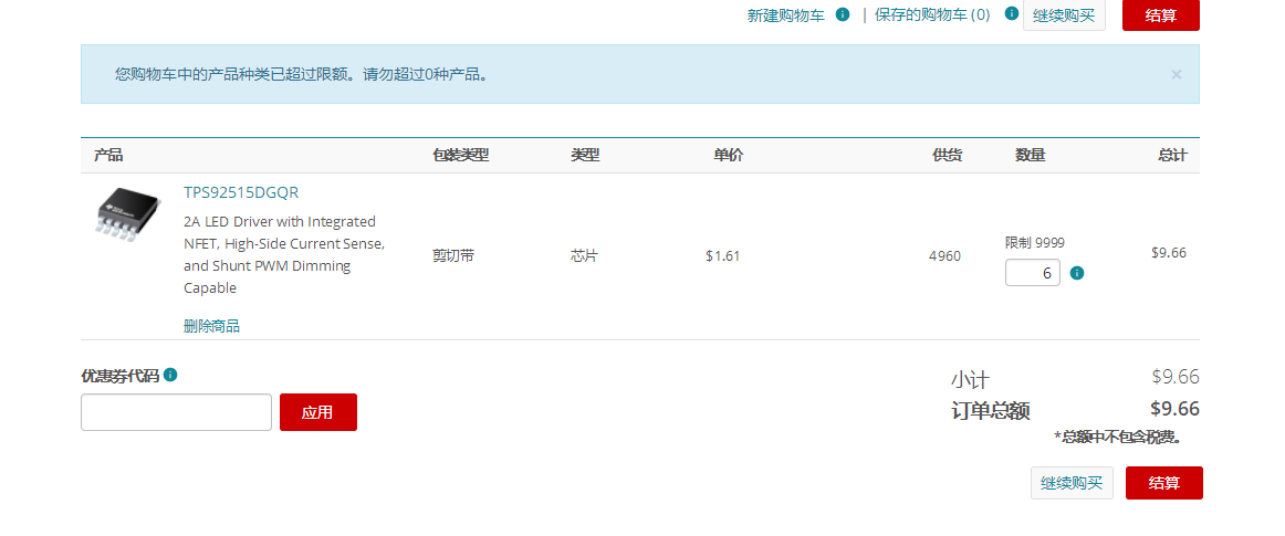 TI store里面直接选购了TPS92515,点击结算后,显示“您购物车中的产品种类已超过限额。请勿超过0种产品。”