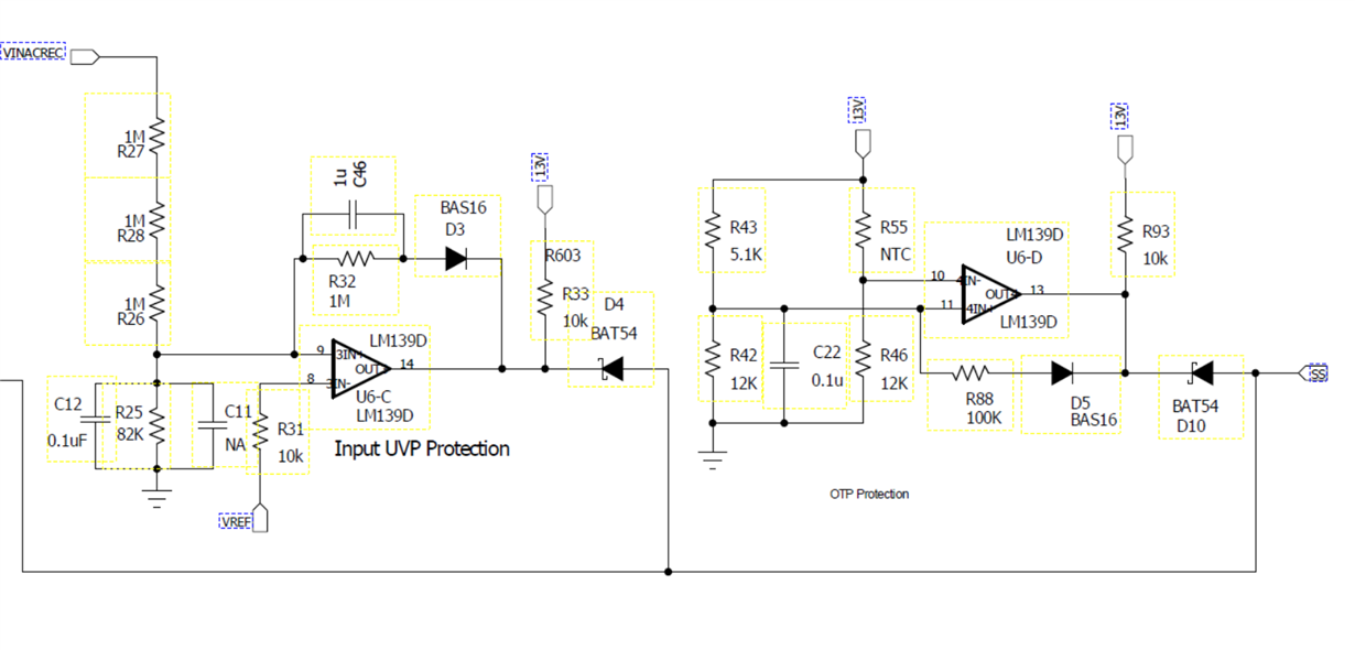 在TI的参考设计 slur515 5000wPFC中 ovp uvp otp都用了一个比较器LM39D来实现。我的疑惑是根据UCCUCC28070手册,其SS PIN在电压低于0.6V才会产生关断PWM输出的作用,而采用的比较器LM39D非轨到轨比较器且手册显示VLO为700mV,如此一来那岂不是无法达到保护的目的了?还是我对电路的理解有误希望高手批评指正。