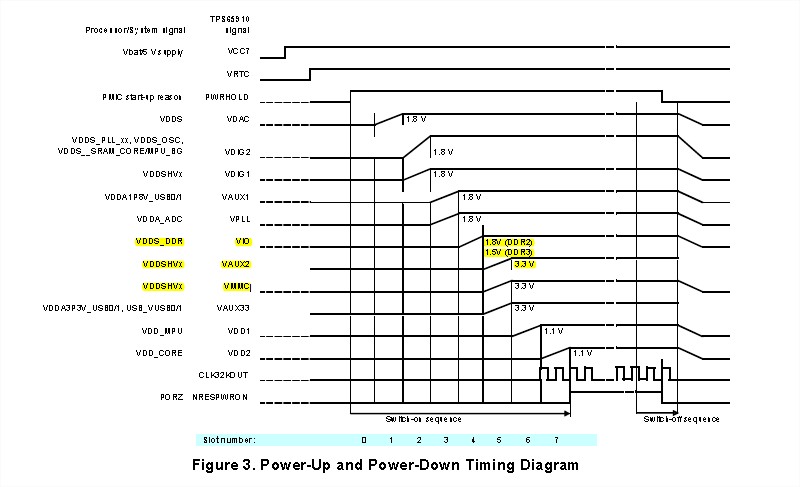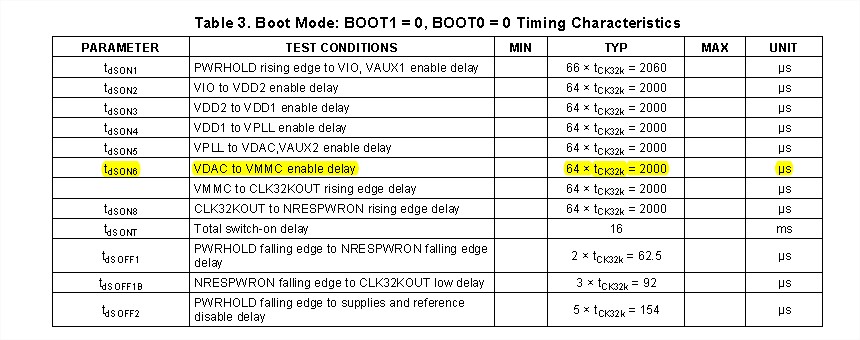 • TPS65910A31所采用的是BOOT方式是EEPROM Sequence,正常上电中:VDIG2的默认设置是Default OFF 1.8 V,其供电VDDS_PLL_xx,VDDS_OSC,VDDS_SRAM_CORE_BG,VDDS_SRAM_MPU_BB 。VDIG2有上电时序要求,既然是Default OFF,那就要系统起来后再进行配置输出,而上电时序中,系统并未起来,这是不是有矛盾之处还是我理解错误?