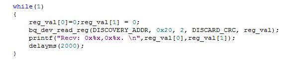 1.我现在使用一块BQ76pl536芯片,首先尝试在设备 0(DEV0) 读0x20,0x21这两个寄存器(还没有重新分配地址),每次都是在bq76pl536上电那一次才是正确的0x80,0x08和手册一致。之后都全部为0.示例代码以及串口打印的数据如下图。