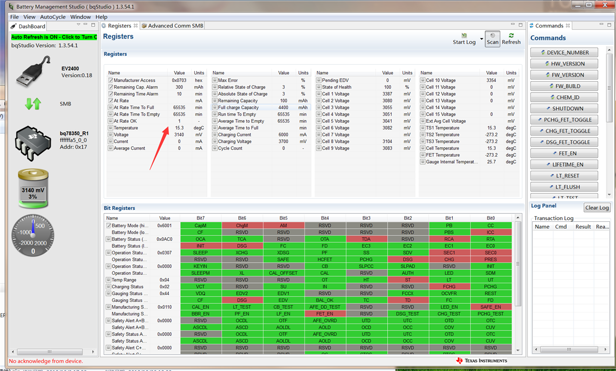 measured temp = 25C, you need to convert it to Kelvin by adding 273.15 then multiplying by 10 to get approx. 2982, bq27426 gauge uses 0.1 Kelvin as a unit for temperature measurement , then convert it to HEX (2982 = 0x0BA6), use the Temperature() command to write this value to the gauge to be used in gauging calculation by using Advance Comm tab: