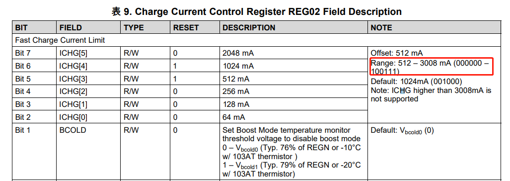 我正在一款TWS充电盒子产品上考虑选用TI BQ24295,看重其升压功能,期望fast charge current是300mA。但在校对规格书时发现寄存器的fast charge current 设置无法理解,寄存器写了range 范围是512-3008mA,但寄存器又写明可以配置成000000-100111(000000是0mA开始),想确认下范围到底是哪一个,如果是512mA的话那该款芯片我就无法使用了,谢谢!