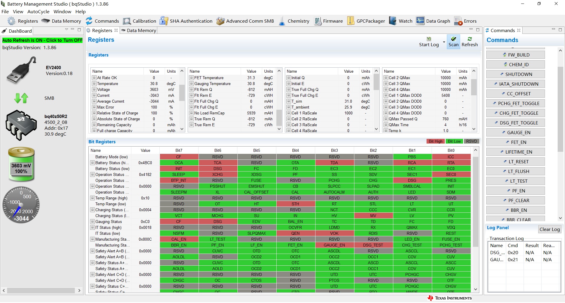 Wed Jan 09 18:44:02 CST 2019 Device Name = bq40z50R2 Firmware Version = V2_08_BLD0050 Design Capacity = 10000 Design Voltage = 3700 Specification Info = 0x0031 Manufacturer Date = 1980-1-1 Serial Number = 0x0001 Manufacturer Name = Texas Instruments Device Name = bq40z50-R2 Device Chemistry = LION Sample,DateTime,ElapsedTime,ManufAccess,RemCapAlarm,RemTimeAlarm,BattMode,@Rate(@),@TimeFull,@TimeEmpty,@RateOK,Temperature,Voltage,Current,AvgCurr,MaxErr,RSOC,ASOC,RemCap,FullChgCap,RunTimeEmty,AvgTimeEmty,AvgTimeFull,ChgCurr,ChgVolt,BattStat,CycleCnt,MaxTurboPwr,SusTurboPwr,MaxTurboCurr,SusTurboCurr,SoH,OpStatA,OpStatB,TempRange,ChgStat,GaugeStat,ITStat,MfgStat,SafetyAlertAB,SafetyStatAB,SafetyAlertCD,SafetyStatCD,PFAlertAB,PFStatAB,PFAlertCD,PFStatCD,CellVolt1,CellVolt2,CellVolt3,CellVolt4,vBAT,vPACK,CellCurr1,CellCurr2,CellCurr3,CellCurr4,CellPower1,CellPower2,CellPower3,CellPower4,Power,AvgPow,IntTemp,TS1Temp,TS2Temp,TS3Temp,TS4Temp,CellTemp,FETTemp,GaugeTemp,FltRemQ,FltRemE,FltFullChgQ,FltFullChgE,NoLoadRemCap,TrueRemQ,TrueRemE,InitialQ,InitialE,TrueFullChgQ,TrueFullChgE,T_sim,T_ambient,RaScale1,RaScale2,RaScale3,RaScale4,CompRes1,CompRes2,CompRes3,CompRes4,PackGrid,LStatus,CellGrid1,CellGrid2,CellGrid3,CellGrid4,StateTime,DOD0_1,DOD0_2,DOD0_3,DOD0_4,DOD0 Passed Q,DOD0 Passed E,DOD0 Time,DODEOC_1,DODEOC_2,DODEOC_3,DODEOC_4,QMax1,QMax2,QMax3,QMax4,QMaxDOD0_1,QMaxDOD0_2,QMaxDOD0_3,QMaxDOD0_4,QMaxPassedQ,QMaxTime,Tk,Ta,RawDOD_1,RawDOD_2,RawDOD_3,RawDOD_4,CBTime1,CBTime2,CBTime3,CBTime4,CBDOD_1,CBDOD_2,CBDOD_3,CBDOD_4,CBTotalDODChg,SOH_FC_Q,SOH_FC_E,LogRowTime(ms),LogStatus 1,2019-01-09 18:44:07,4.058,0x4182,1000,10,0x6081,0,65535,65535,0,30.2,3594,-3024,-3025,100,100,0,0,0,0,0,65535,0,0,0x4BC0,0,-17971,-17971,-19968,-19968,0,0x4182,0x0000,0x10,0x0002,0xC0,0x0018,0x800C,0x0000,0x0000,0x0000,0x0000,0x0000,0x0000,0x0000,0x0000,3594,0,0,0,3561,2952,-3034,0,0,0,-1090,0,0,0,-1087,-1087,34.5,30.3,30.6,30.5,32.4,30.3,30.6,30.3,-1220,-1096,0,0,5531,-1220,-1096,0,0,0,0,31.0,25.9,1000,0,0,0,0,0,0,0,0,4,0,0,0,0,1381,5408,0,0,0,1168,1051,7,1200,0,0,0,10000,10000,10000,10000,5408,0,0,0,1168,7,1.0,1000,5408,0,0,0,0,0,0,0,0,0,0,0,0,0,0,1029,SUCCESS 2,2019-01-09 18:44:11,8.060,0x4182,1000,10,0x6081,0,65535,65535,0,30.2,3594,-3025,-3025,100,100,0,0,0,0,0,65535,0,0,0x4BC0,0,-17952,-17952,-19947,-19947,0,0x4182,0x0000,0x10,0x0002,0xC0,0x0018,0x800C,0x0000,0x0000,0x0000,0x0000,0x0000,0x0000,0x0000,0x0000,3594,0,0,0,3561,2952,-3030,0,0,0,-1089,0,0,0,-1087,-1087,34.5,30.2,30.6,30.4,32.4,30.2,30.6,30.2,-1224,-1099,0,0,5528,-1224,-1099,0,0,0,0,31.0,25.9,1000,0,0,0,0,0,0,0,0,4,0,0,0,0,1385,5408,0,0,0,1172,1054,7,1200,0,0,0,10000,10000,10000,10000,5408,0,0,0,1172,7,1.0,1000,5408,0,0,0,0,0,0,0,0,0,0,0,0,0,0,999,SUCCESS 3,2019-01-09 18:44:15,12.057,0x4182,1000,10,0x6081,0,65535,65535,0,30.1,3594,-3024,-3025,100,100,0,0,0,0,0,65535,0,0,0x4BC0,0,-17990,-17990,-19989,-19989,0,0x4182,0x0000,0x10,0x0002,0xC0,0x0018,0x800C,0x0000,0x0000,0x0000,0x0000,0x0000,0x0000,0x0000,0x0000,3594,0,0,0,3562,2949,-3030,0,0,0,-1089,0,0,0,-1087,-1087,34.5,30.1,30.2,30.1,32.3,30.1,30.2,30.1,-1227,-1102,0,0,5525,-1227,-1102,0,0,0,0,31.0,25.9,1000,0,0,0,0,0,0,0,0,4,0,0,0,0,1389,5408,0,0,0,1175,1057,7,1200,0,0,0,10000,10000,10000,10000,5408,0,0,0,1175,7,1.0,1000,5408,0,0,0,0,0,0,0,0,0,0,0,0,0,0,1016,SUCCESS 4,2019-01-09 18:44:19,16.059,0x4182,1000,10,0x6081,0,65535,65535,0,30.2,3594,-3024,-3025,100,100,0,0,0,0,0,65535,0,0,0x4BC0,0,-17990,-17990,-19989,-19989,0,0x4182,0x0000,0x10,0x0002,0xC0,0x0018,0x800C,0x0000,0x0000,0x0000,0x0000,0x0000,0x0000,0x0000,0x0000,3594,0,0,0,3560,2949,-3029,0,0,0,-1089,0,0,0,-1086,-1087,34.5,30.1,30.4,30.3,32.4,30.1,30.4,30.1,-1230,-1105,0,0,5521,-1230,-1105,0,0,0,0,31.0,25.9,1000,0,0,0,0,0,0,0,0,4,0,0,0,0,1393,5408,0,0,0,1178,1060,7,1200,0,0,0,10000,10000,10000,10000,5408,0,0,0,1179,7,1.0,1000,5408,0,0,0,0,0,0,0,0,0,0,0,0,0,0,1028,SUCCESS 5,2019-01-09 18:44:23,20.058,0x4182,1000,10,0x6081,0,65535,65535,0,30.1,3594,-3024,-3024,100,100,0,0,0,0,0,65535,0,0,0x4BC0,0,-17990,-17990,-19989,-19989,0,0x4182,0x0000,0x10,0x0002,0xC0,0x0018,0x800C,0x0000,0x0000,0x0000,0x0000,0x0000,0x0000,0x0000,0x0000,3594,0,0,0,3559,2949,-3031,0,0,0,-1089,0,0,0,-1086,-1087,34.5,30.2,30.5,30.3,32.5,30.2,30.5,30.2,-1234,-1108,0,0,5518,-1234,-1108,0,0,0,0,31.0,25.9,1000,0,0,0,0,0,0,0,0,4,0,0,0,0,1398,5408,0,0,0,1182,1063,7,1200,0,0,0,10000,10000,10000,10000,5408,0,0,0,1182,7,1.0,1000,5408,0,0,0,0,0,0,0,0,0,0,0,0,0,0,1030,SUCCESS 6,2019-01-09 18:44:27,24.058,0x4182,1000,10,0x6081,0,65535,65535,0,30.2,3594,-3023,-3024,100,100,0,0,0,0,0,65535,0,0,0x4BC0,0,-17971,-17971,-19968,-19968,0,0x4182,0x0000,0x10,0x0002,0xC0,0x0018,0x800C,0x0000,0x0000,0x0000,0x0000,0x0000,0x0000,0x0000,0x0000,3594,0,0,0,3561,2949,-3032,0,0,0,-1090,0,0,0,-1086,-1087,34.5,30.2,30.6,30.5,32.5,30.2,30.6,30.2,-1237,-1111,0,0,5514,-1237,-1111,0,0,0,0,31.0,25.9,1000,0,0,0,0,0,0,0,0,4,0,0,0,0,1402,5408,0,0,0,1185,1066,7,1200,0,0,0,10000,10000,10000,10000,5408,0,0,0,1185,7,1.0,1000,5408,0,0,0,0,0,0,0,0,0,0,0,0,0,0,1046,SUCCESS 7,2019-01-09 18:44:31,28.060,0x4182,1000,10,0x6081,0,65535,65535,0,30.1,3594,-3024,-3024,100,100,0,0,0,0,0,65535,0,0,0x4BC0,0,-17952,-17952,-19947,-19947,0,0x4182,0x0000,0x10,0x0002,0xC0,0x0018,0x800C,0x0000,0x0000,0x0000,0x0000,0x0000,0x0000,0x0000,0x0000,3594,0,0,0,3560,2949,-3032,0,0,0,-1090,0,0,0,-1086,-1087,34.5,29.9,30.2,30.3,32.5,29.9,30.3,29.9,-1241,-1115,0,0,5511,-1241,-1115,0,0,0,0,31.0,25.9,1000,0,0,0,0,0,0,0,0,4,0,0,0,0,1406,5408,0,0,0,1189,1070,7,1200,0,0,0,10000,10000,10000,10000,5408,0,0,0,1189,7,1.0,1000,5408,0,0,0,0,0,0,0,0,0,0,0,0,0,0,1012,SUCCESS 8,2019-01-09 18:44:35,32.058,0x4182,1000,10,0x6081,0,65535,65535,0,30.1,3594,-3024,-3024,100,100,0,0,0,0,0,65535,0,0,0x4BC0,0,-17952,-17952,-19947,-19947,0,0x4182,0x0000,0x10,0x0002,0xC0,0x0018,0x800C,0x0000,0x0000,0x0000,0x0000,0x0000,0x0000,0x0000,0x0000,3594,0,0,0,3560,2949,-3031,0,0,0,-1089,0,0,0,-1086,-1087,34.5,30.1,30.4,30.3,32.5,30.1,30.4,30.1,-1244,-1117,0,0,5507,-1244,-1117,0,0,0,0,31.0,25.