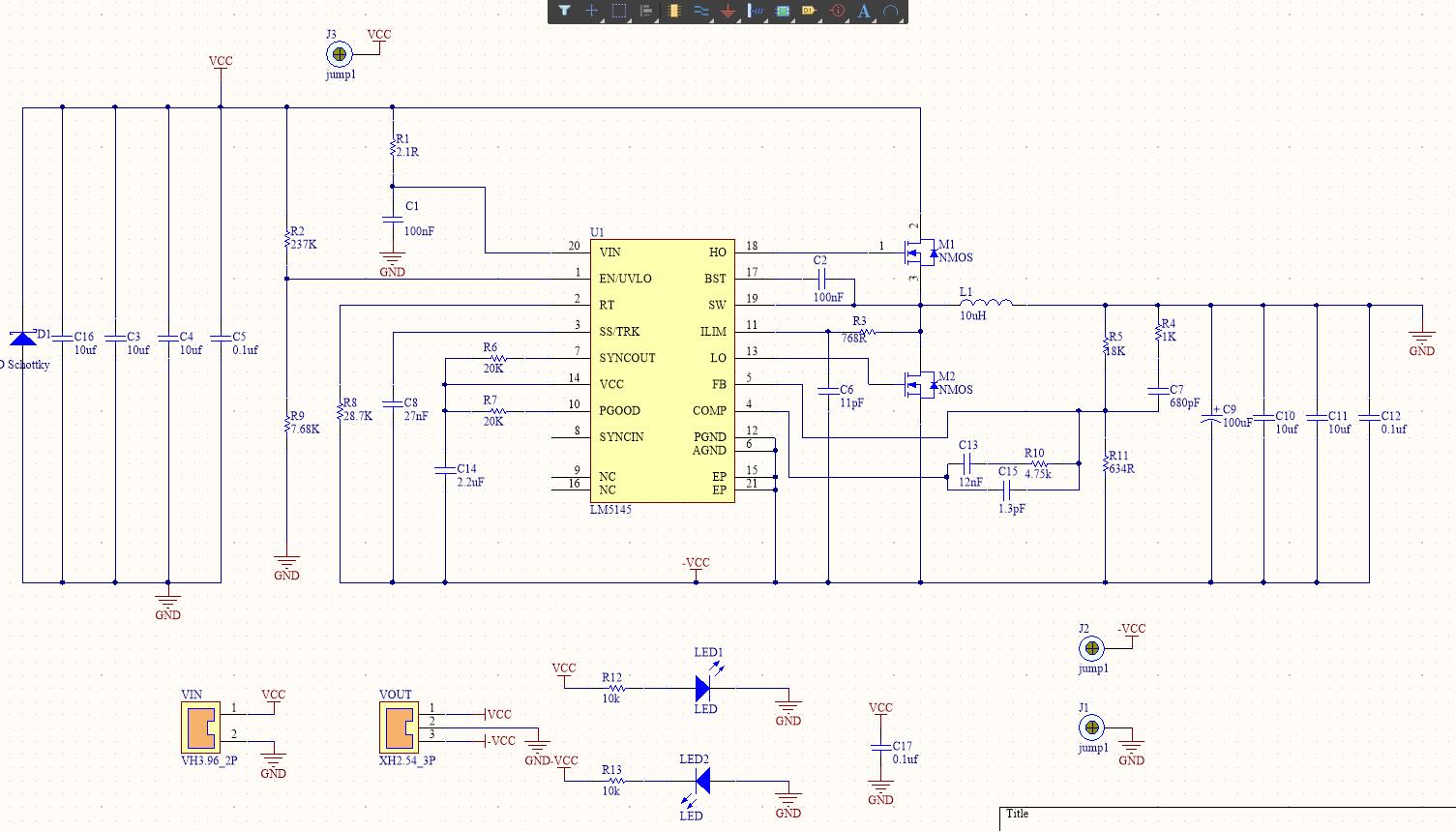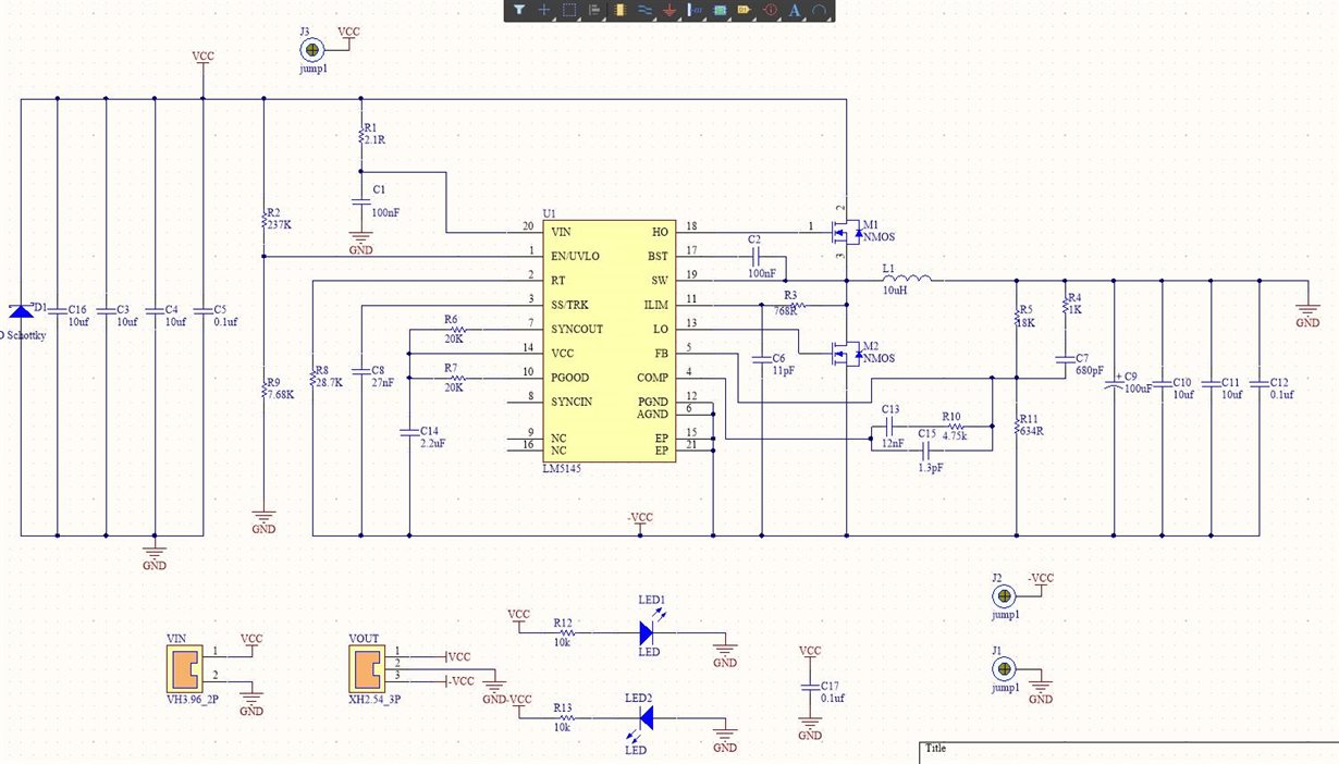 我用一个500W,24V开关电源做供电,用LM5145把正24V转换成负24V,输出电流小于800mA时输出负24V电压正常,输出电流大于800mA后输出电压急速下降,电流2A时,输出电压下降到了负12V, 请问下,是哪里出了问题,电路图如下: