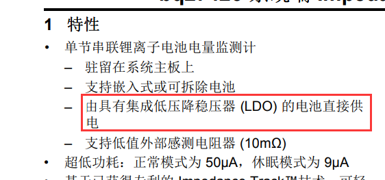 我们使用的是18650电池,可以直接把电池的正负极接到BQ27426上么?中间需要加LDO么?这里由具有集成低压降稳压器 (LDO) 的电池直接供电是什么意思呢?没能理解。