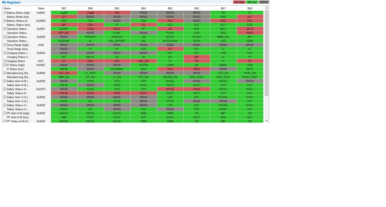 各位专家,我的BQ40Z50_R2一上电,就有-32767mA的放电电流,疑似发生短路故障,为什么会这样?我的PRES引脚(16引脚)是直接接GND的,没有接10kΩ的下拉电阻,难道是这个导致的?附上我的寄存器状态位。