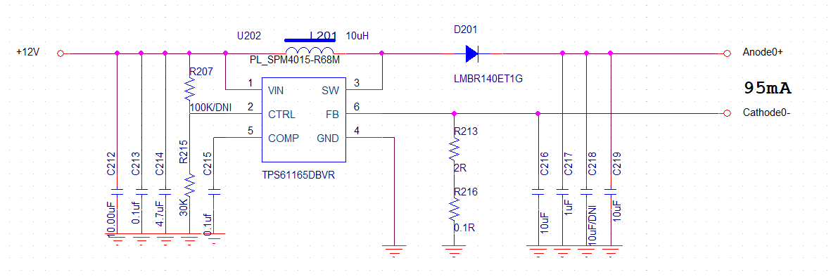 求助各位工程师,电路这样接,当我的负载挂一个3串5并的LED组时,FB的电压测量达到400mv,输出的电流也达到200ma(这里有一点,就是我用直流稳压电压直接给这个LED组供电的时候,电压是11.5V,电流是200mv),电流怎么没有按照计算的95ma来给,FB电压怎么会高出两倍,如果接的负载所需功率大于电路中设计能够输出的功率会不会导致这种情况,求教各位工程师