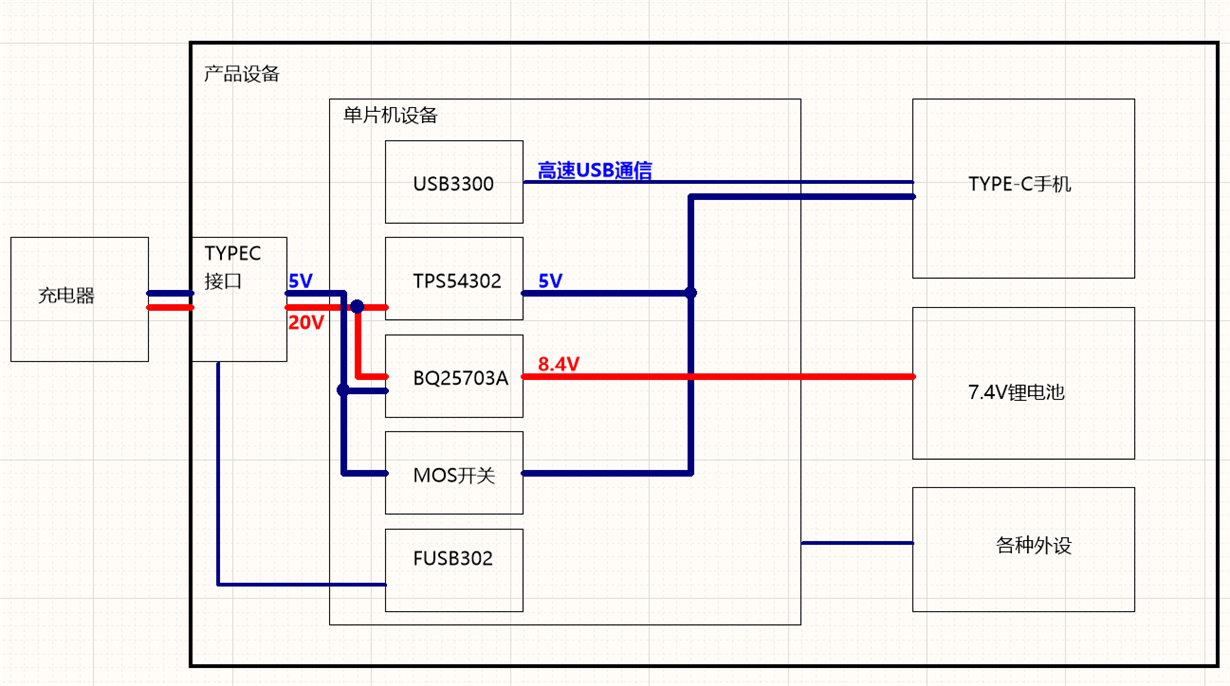 我是这样的系统,用普通充电器去充电的时候走5V通道,用USB PD充电器去充电的时候走20V通道,但是我在充电过程中发现,明明充电器的功率足够,但是只能正常给我的7.4V锂电池充电,手机显示在充电,但实际只是保持电量不下降,不会真正充进去,只有我关掉7.4V的充电通道,手机的电量才会慢慢上来,但是我充电器功率明明足够的,就是不输出而已。而且我现在也没办法做到高速通信的时候同时给手机充电,都是在充电的时候切断CC1和CC2才能充进去,这个时候手机通信就断开了,不知道有没有什么联系?求助求方案啊,到时候加联系方式给一些资金补偿都行,求大神相助。用的是小米手机。