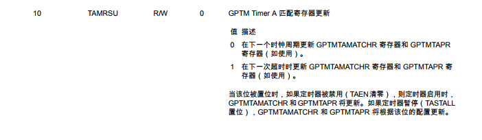 定时器里的GPTMTAMR寄存器的第10位TAMRSU怎么理解"在下一次超时时更新",是指过了定时器周期后匹配值自动更新的意思么?寄存器对电机控制很重要,麻烦帮忙尽可能说得详细一点,谢谢!