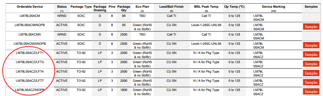LM78L05ACZ/LFT1   请问这颗料和 LM78L05ACZ/NOPB 有什么区别 , 看规格书 这几个好像没有什么太大的区别~