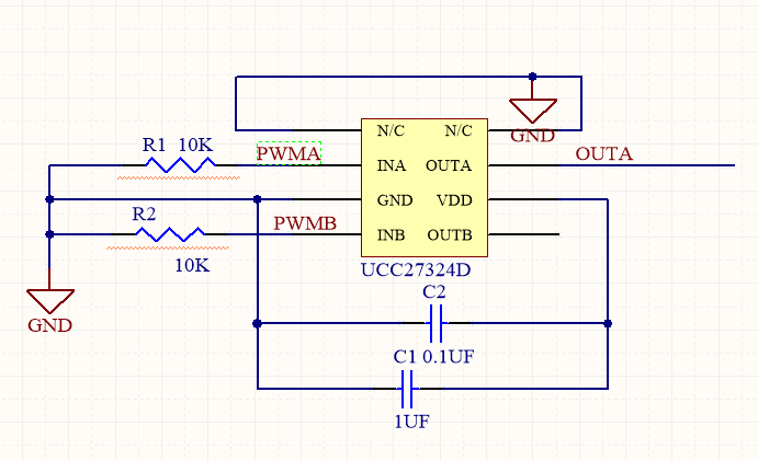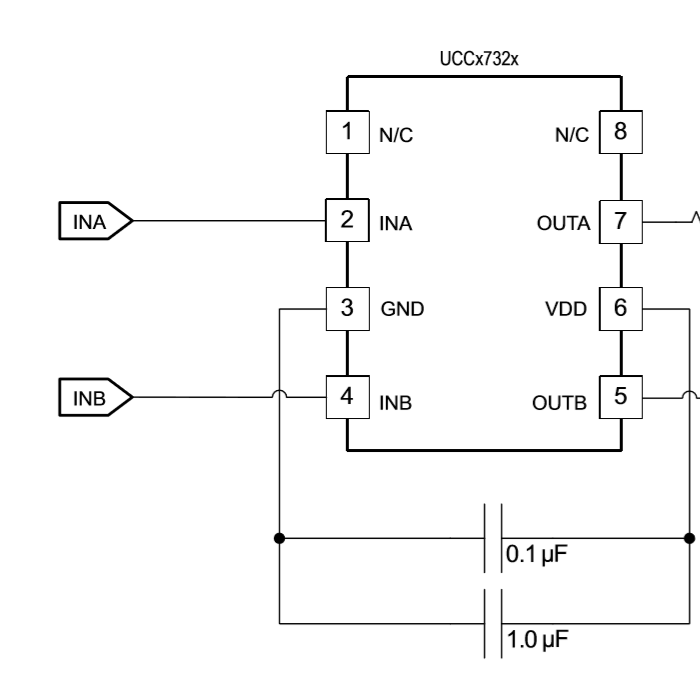 mosfet的驱动芯片UCC27324D,我自己搭了一个典型应用电路(电路如下图),6脚电压12V,2脚用信号发生器产生50KHZ,幅值3.3V,占空比40%的脉冲,7脚示波器显示输出是230mV脉冲,哪里出错了,信号发生器的地和示波器的地要连接一起吗?