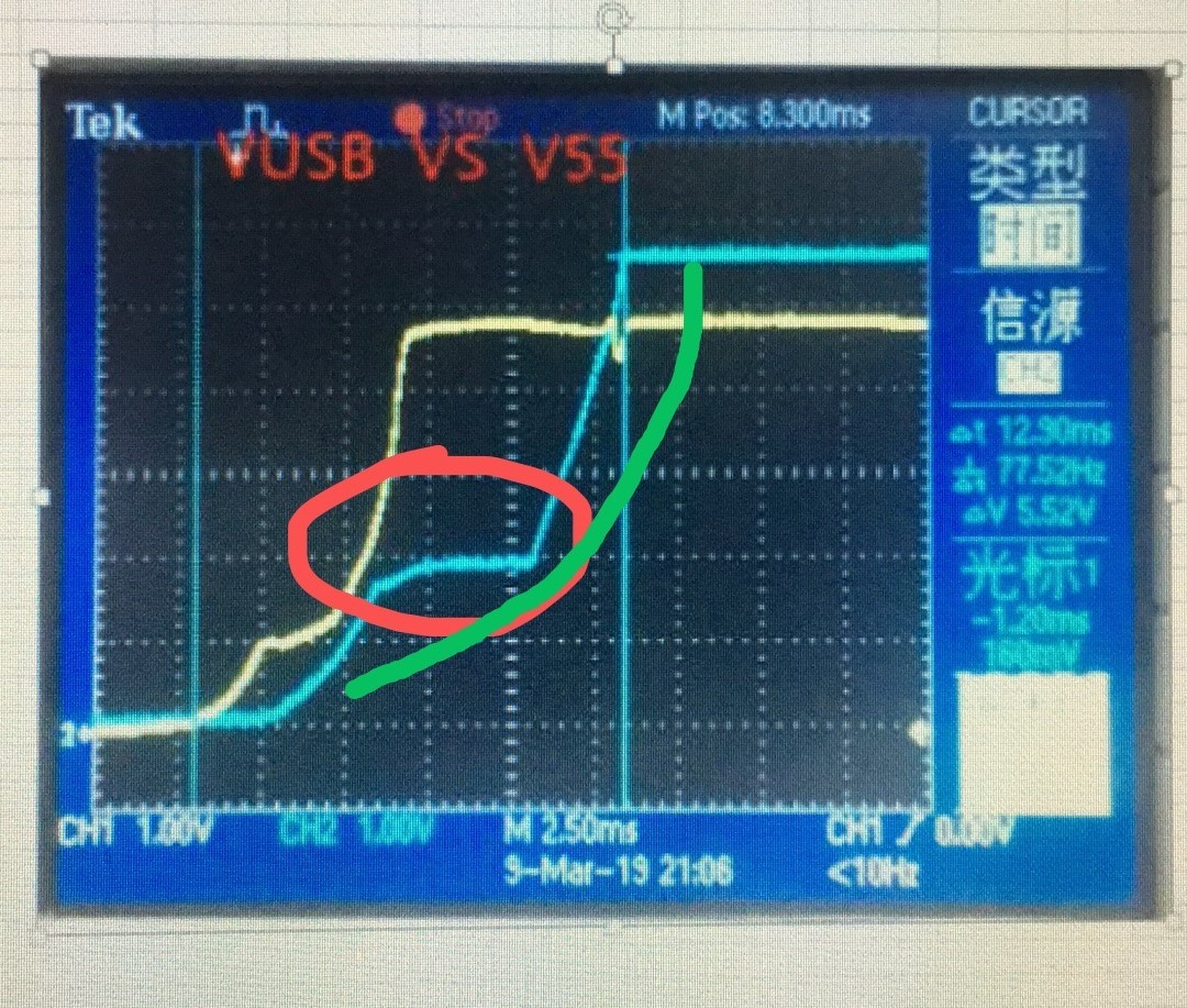 如图,从USB输出5V通过TPS61020升到5.5V,为什么输出波形在中途会出现如图所示的情况
