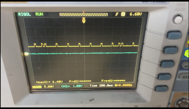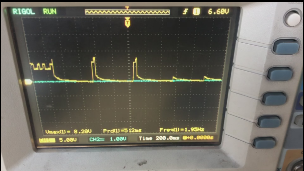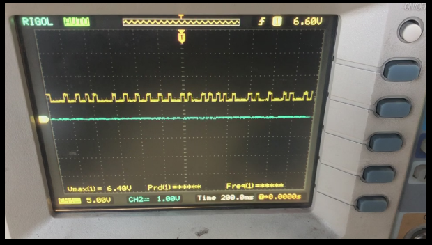 基本上每次都可以遇到这个问题,我使用的电池容量为1800mAH,设定电流为1A左右,在开始充电的时间里,它没有任何异常,在电池电压上升到3.7V左右时,电流为800MA,此时,VRECT引脚电压会变得非常混乱,随后充电过程停止,并且发射器报错。我目前使用的线圈是TDK的WR483265-15F5-G 13.3uH,发射器为三星的EP-EN920,下图是VRECT引脚的电压值,
