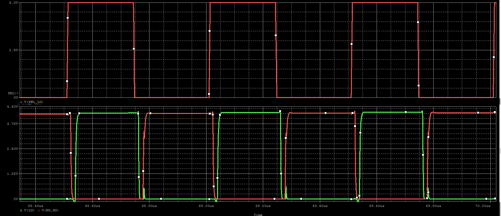 我测试半桥结构电路时候,按照datashee当使能端18脚接高电平,HO端的波形应该跟PWM端的波形相位一致的,仿真结果是相反的