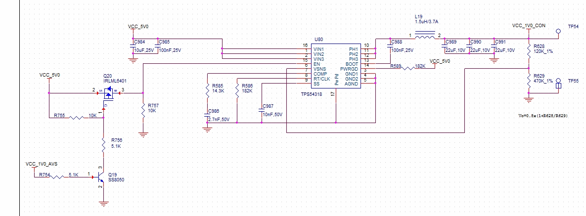 大家好,小弟初用TPS54318,电路如图中所示,原本想用VCC_1V0_AVS(1v)来控制5V来使能TPS54318,让其输出VCC_1V0_CON(1V), 但是事与愿违,怎么一块板子输出的是0.7V左右,另外几块输出的是0.5V左右,我看DATAsheet上是这么设计的呀,但是实际输出就是不到我想要的1V,请求达人赐教。