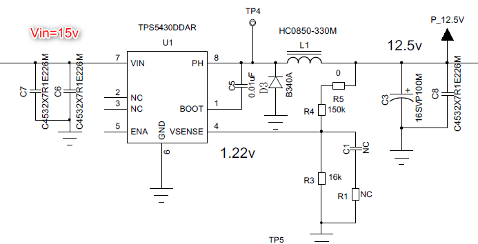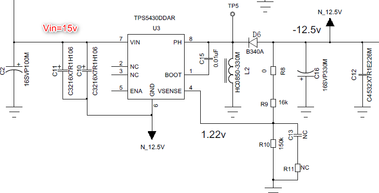 电源输入15v,使用TPS5430 产生+12.5v 和 -12.5v,电路图如下图所示。