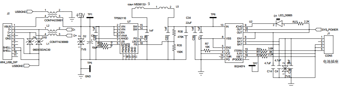 使用DC9V供电,TPS62110降压为4.8V给bq24074供电,bq24074给单节锂电充电。