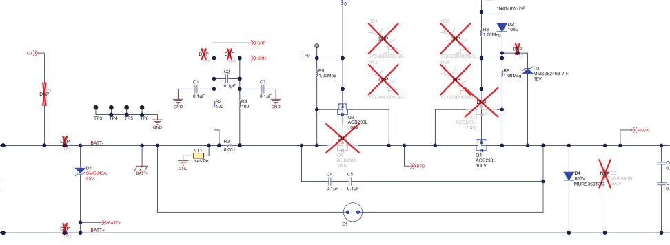 我看BQ76930的EVM评估板的说明书里的原理图上面很多都花了红色的叉,这是什么意思,是说这些都不存在评估板上吗