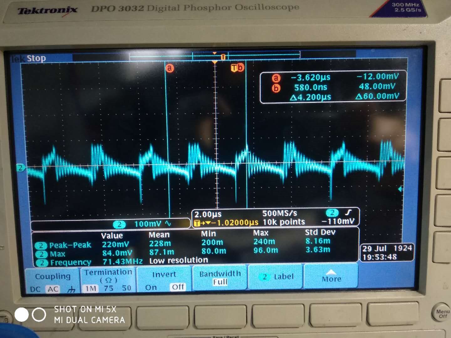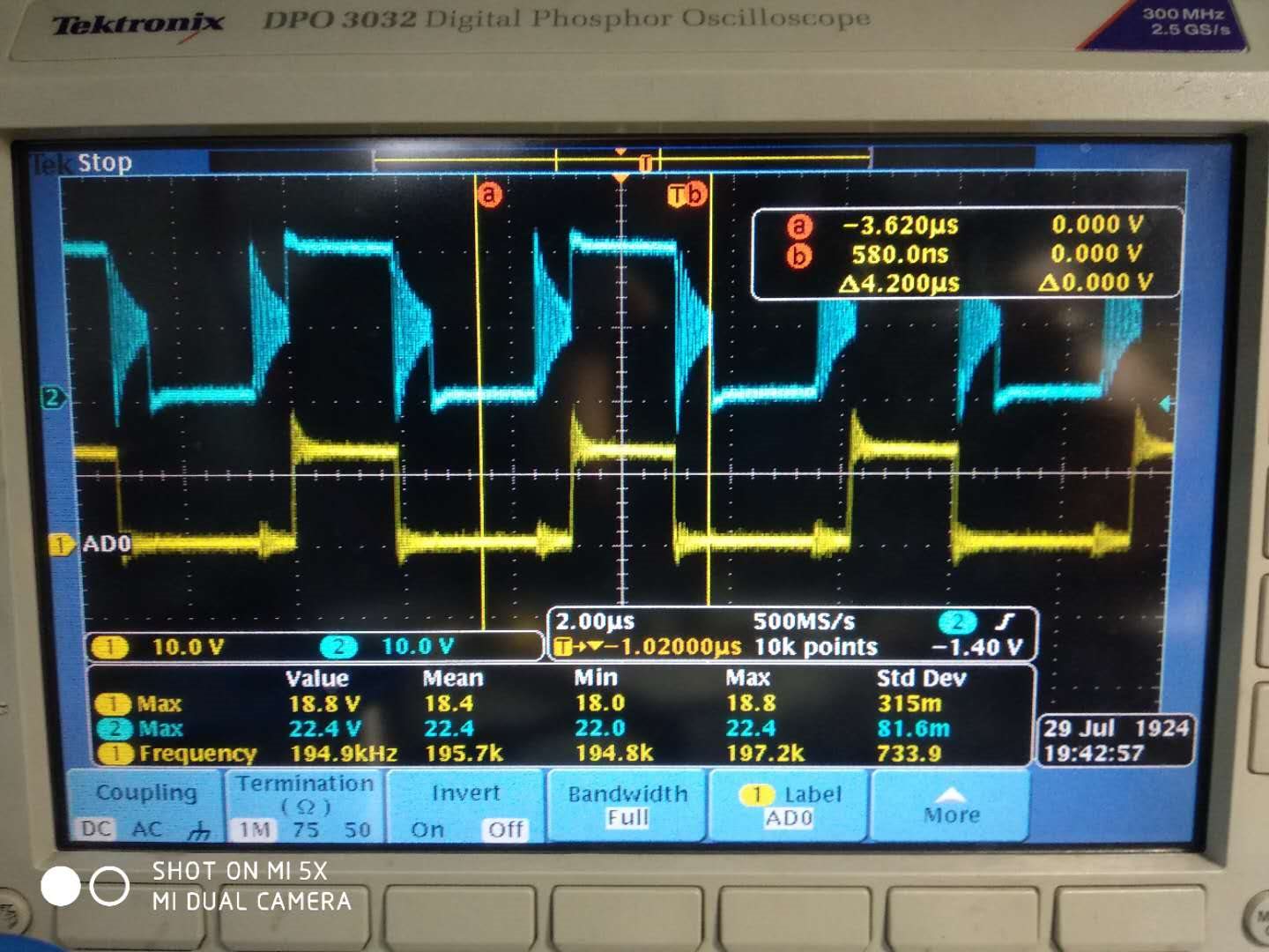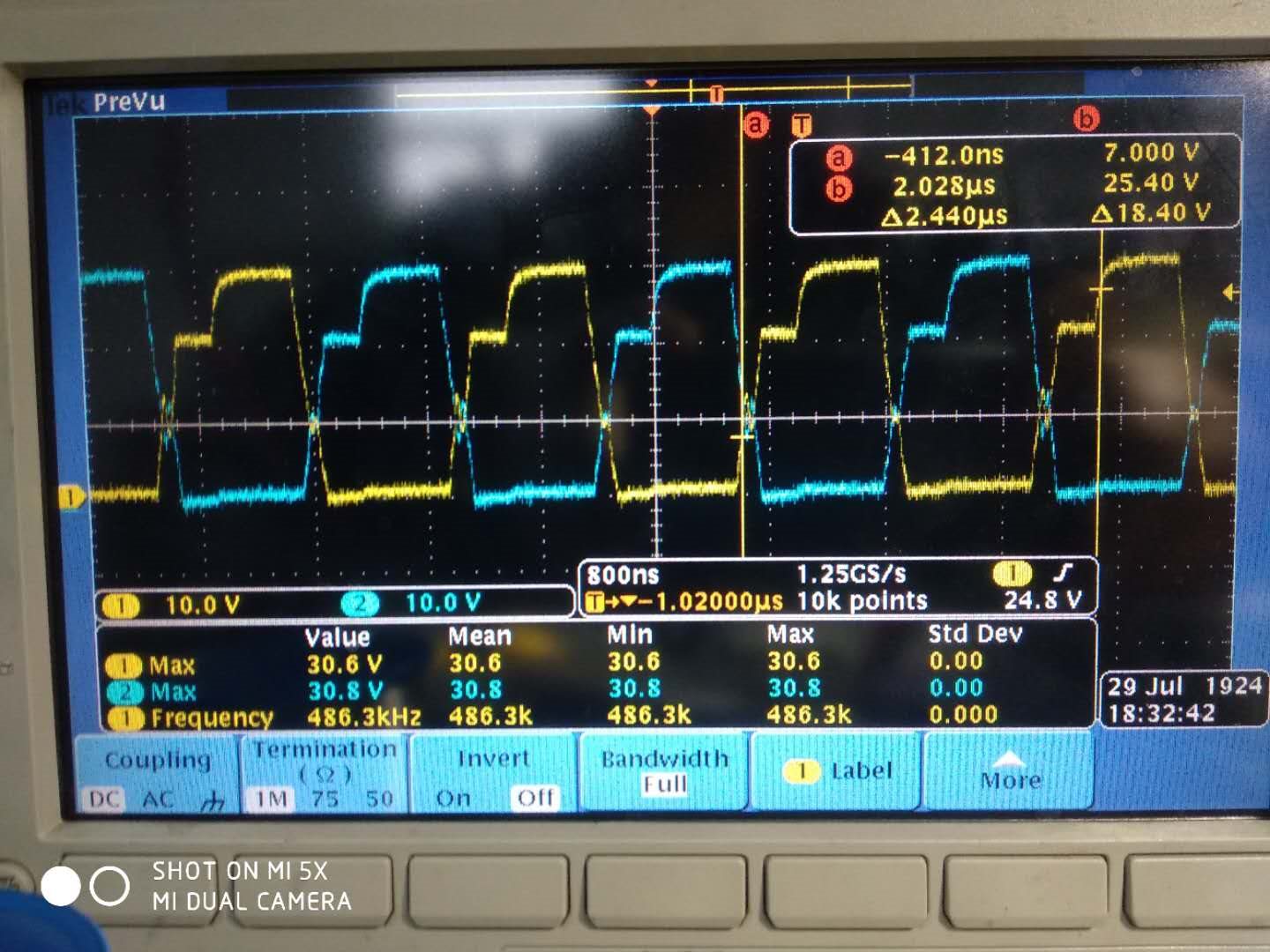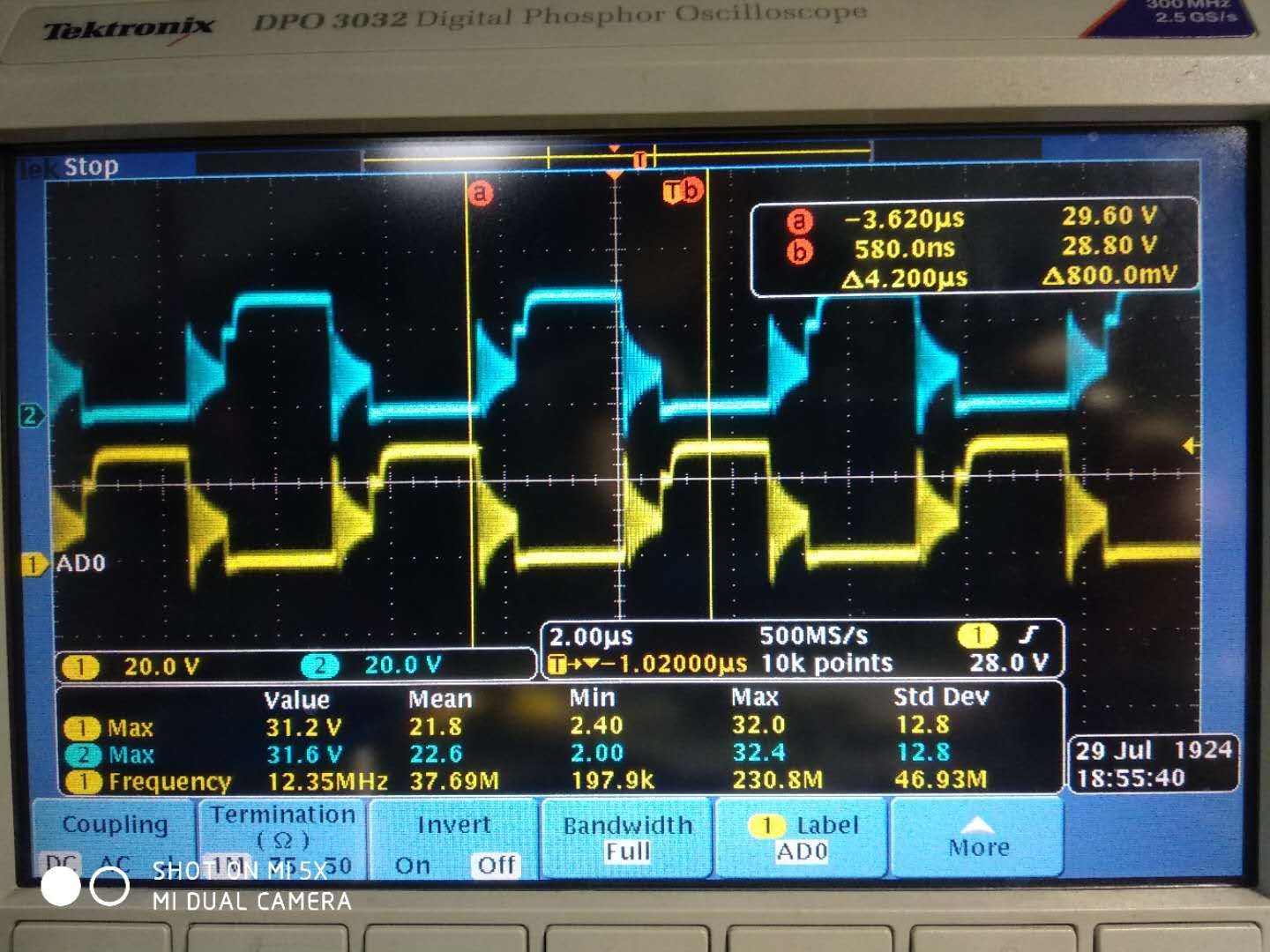 上图黄色是变压器初级绕组,也就是MOS管桥臂中间点波形。当初级MOS管都关断时,波形一直振荡,很异常。
