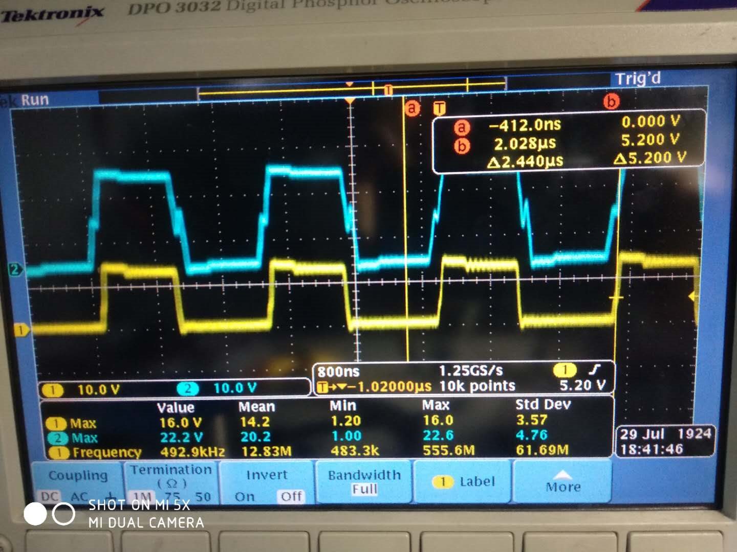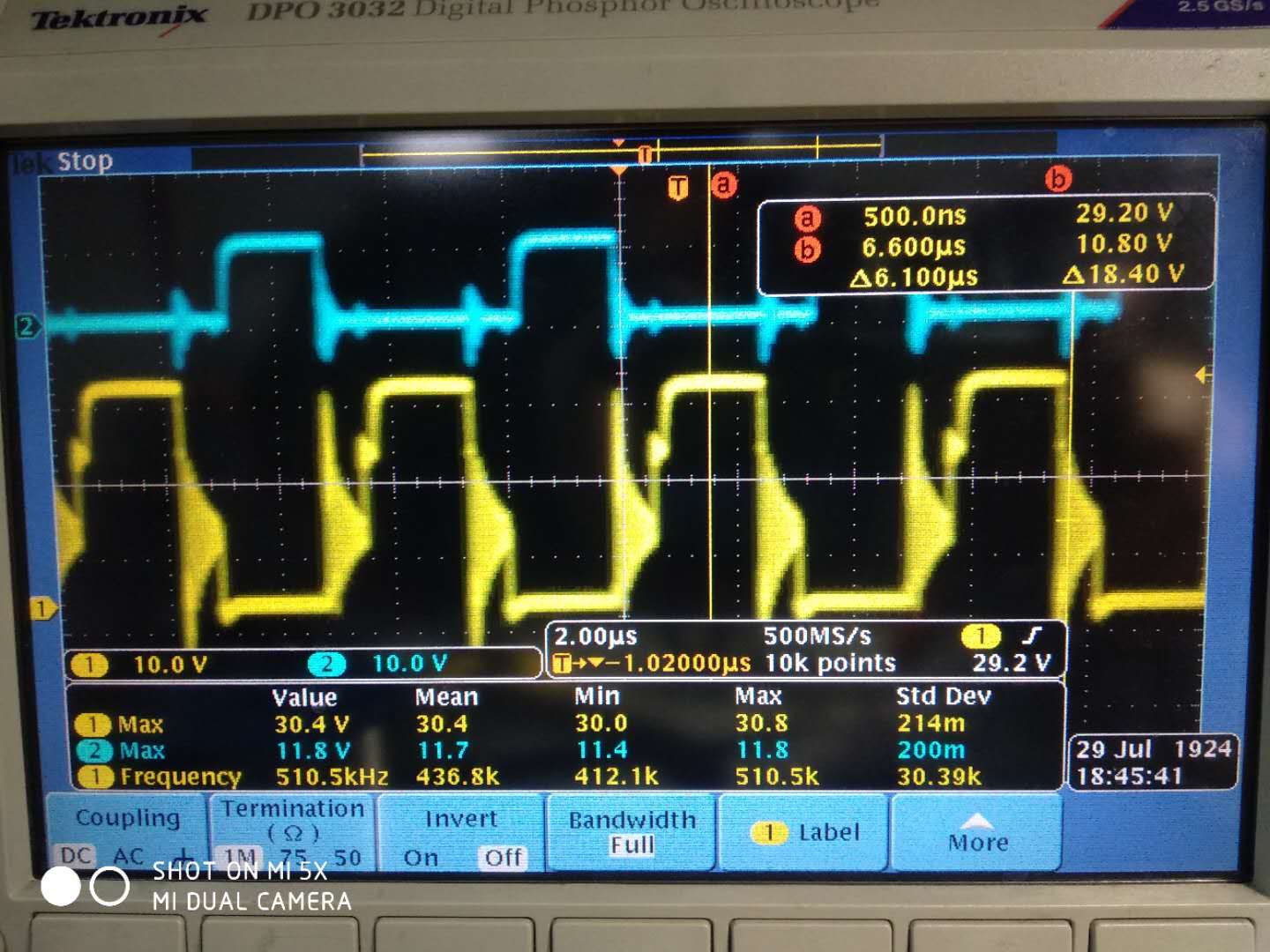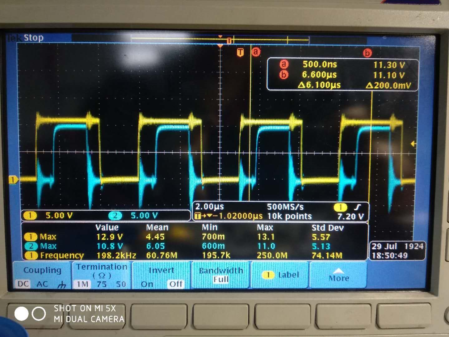 上图黄色是变压器初级绕组,也就是MOS管桥臂中间点波形。当初级MOS管都关断时,波形一直振荡,很异常。