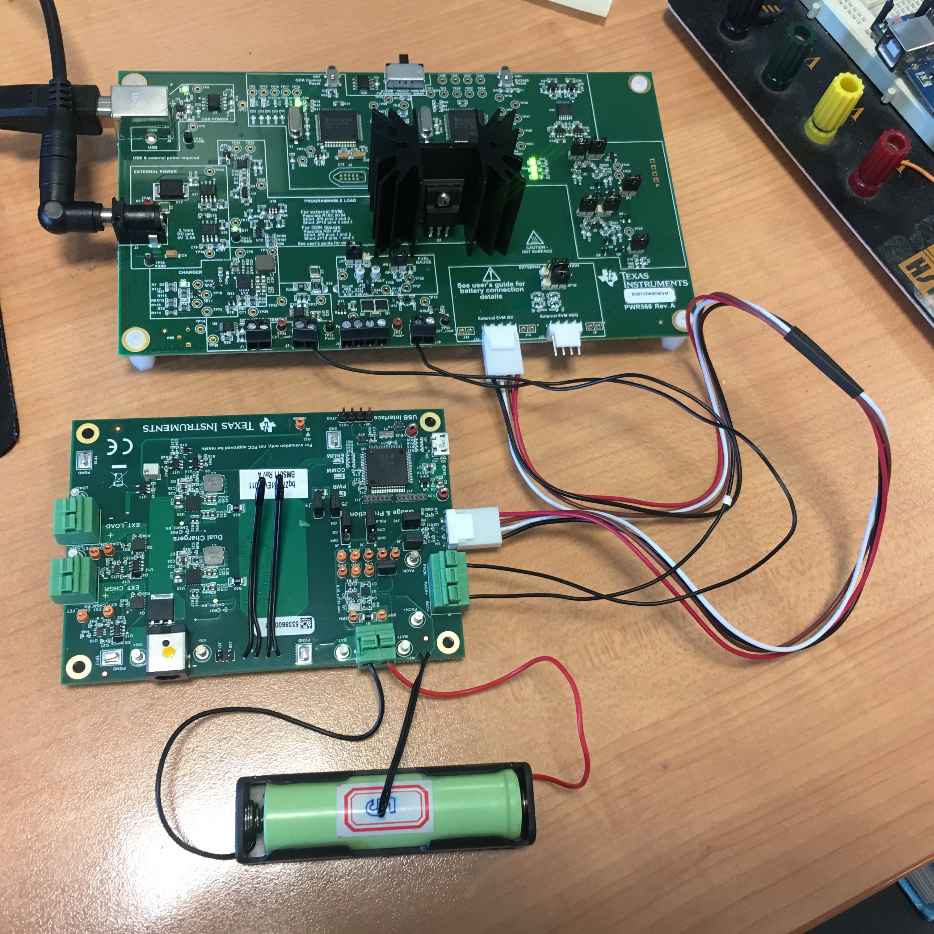 我最近在用 BQ27z561EVM-011 和 BQ27GDK000EVM 一起做一项关于电池模型验证的研究。我按照使用手册 (http://www.ti.com/lit/ug/sluuao1a/sluuao1a.pdf) 上的指导连接了所有设备,最后系统的硬件连接如下: