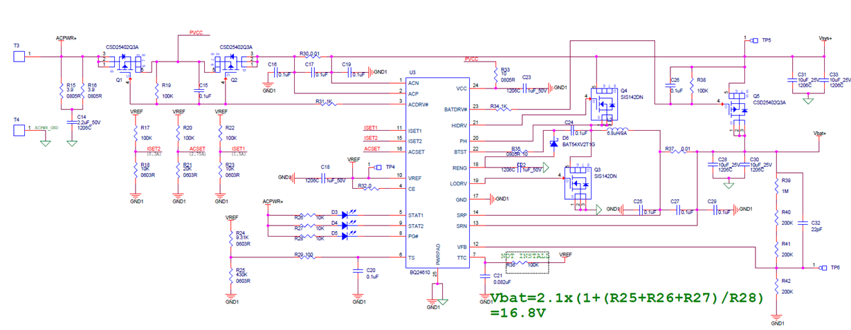 您好,我用BQ24610设计的4串1并锂电池充电电路,输入电压为19.5V,充电电压设置为16.8V,当不接电池的时候VFB为2.1V,而接上电池的时候VFB变成了1.88V,此时电池电压为15.28V左右。SATA1和SATA2灯始终不亮;VREF为3.3V,RENG为5.98V,TS位3.22V,HIDRV为15.28V,LODRV为0V。