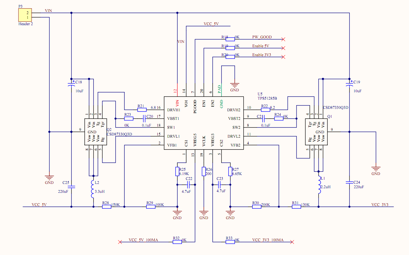 7、与TPS51285B手册里的参考设计的区别只是3.3V与5V的输出端各用了1颗220uf的钽电容,参考设计各用了2颗220uf电容