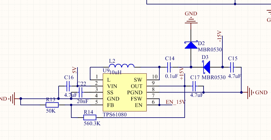 如图,按TPS61080手册上的电路做的板子,输入是5V,FSW和EN引脚是用的MSP430的IO引脚控制的,当EN高电平时,本来输出应该是±15V,实际输出为正负7伏左右,且芯片及电感发热严重,时间长后板子高温自动断电。